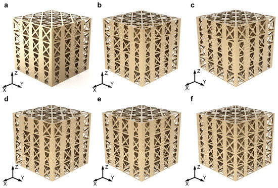 In our design, the strength and stiffness of the structures are predominantly determined by the macroscopic lattice struts, similar to the fact that the strength and stiffness of the material are determined by the atomic bonding in the crystal lattice, as shown in Figure 1a. When there is no solid solution strengthening, all struts have the same diameter. As shown in Figure 1b, when solid solution strengthening is applied, struts along the loading direction will have a larger diameter to mimic the solid solute strengthening along the [001] crystal direction. When the struts are strengthened along the loading direction ([001] in this context, referred to as [001]-strengthened sosoloid), the diameter of the red struts along [001] is greater than that of the other struts. The base struts are strengthened by a solid solution, and the non-base struts are not strengthened by a solid solution. Figure 1c–f show the scheme of solid solute strengthening in other crystal directions.