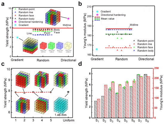 On the other hand, the lattice structure composed of [001]-strengthened sosoloid still possesses the optimal spatial layout because of its uniform size and directional arrangement and achieves the highest mechanical properties compared to other types of lattice structures under the same mass. We can stack the [001]-strengthened sosoloid of the same and different grain sizes in an orderly and regular manner in the three-dimensional filling space to become various lattice structures at the same mass (Figure 7). Among them, the gradient lattice structures with the four grain sizes (d = 0.97 mm, 1.28 mm, 1.73 mm and 2.36 mm) (Figure 8a) were compared with the uniform lattice structures without sosoloid (S1) under the equal mass conditions (with all strut diameters evenly distributed at 0.99 mm). The yield strength and Young’s modulus of the gradient lattice structures with the sosoloid increased by 29.41% and 74.76%, respectively (S1 and S2 of Figure 8d). In fact, the gradient lattice structures usually show very poor mechanical properties and always begin to buckle and fail from the minimum strut diameter and gradually increase [42]. It is attributed to the huge enhancement effect brought by sosoloid to offset the strength-weakening effect of the gradient lattice structures under the premise of efficient utilization of materials. In addition, when sosoloids of the same grain size are axially aggregated (directionally enhancement lattice structures, S7), the axial hardening effect just completely cancels the strength weakening effect of the gradient lattice structures, thus achieving a [001]-strengthened sosoloid lattice structures (S8) with equal mass and properties (Figure 8c). When sosoloids of the same grain size are dispersed and arranged, the axial hardening effect and radial weakening effect of the randomly enhancement lattice structures become a competing mechanism. Also, their performance is lower than the average performance (midline) of the horizontal gradient lattice structures and directionally enhancement lattice structures with [001]-strengthened sosoloid (Figure 8a,b).