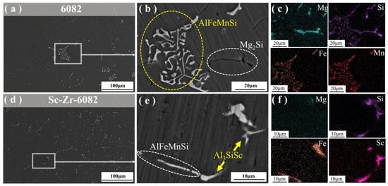 SEM images of 6082 alloy and Sc-Zr-6082 alloy: (a–c) for 6082 alloy; (d–f) for Sc-Zr-6082 alloy.