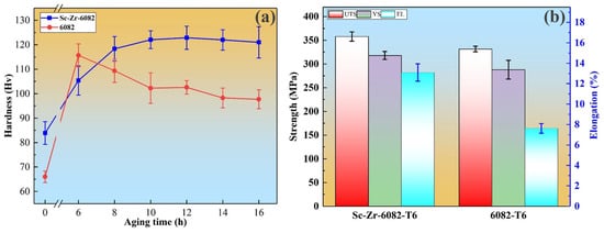 Figure 6a illustrates the Vickers hardness evolution of the squeeze-cast 6082 alloy and Sc-Zr-6082 alloy during isothermal aging at 180 °C. The “0 h” datum represents the as-cast condition prior to heat treatment. It is evident from Figure 6 that the addition of Sc and Zr significantly enhances the initial hardness of the alloy, indicating that these elements play a positive role in strengthening the alloy. As the aging time increases, the hardness rises rapidly, with the 6082 alloy reaching peak hardness after 6 h, at which point its hardness exceeds that of the Sc-Zr-6082 alloy. However, with further aging, the hardness of the 6082 alloy gradually decreases. In contrast, the Sc-Zr-6082 alloy exhibits a more stable hardness increase during the initial aging phase, reaching its peak hardness at 12 h. Even with further aging, the hardness of the Sc-Zr-6082 alloy decreases only slightly, demonstrating better aging stability. This result aligns with the findings reported in reference [].