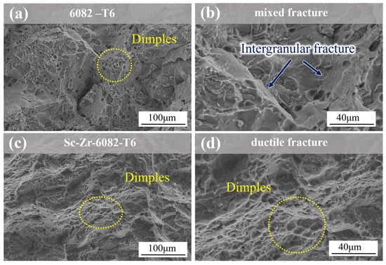 SEM fracture micrographs of tensile samples of 6082 alloy and Sc-Zr-6082 alloy after heat treatment: (a,b) the 6082 alloy; (c,d) the Sc-Zr-6082 alloy.