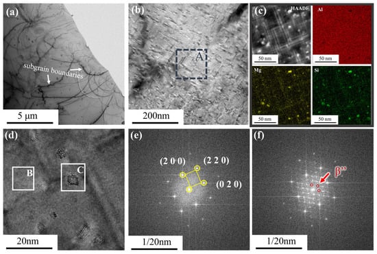 Figure 9 presents TEM images of the Sc-Zr-6082 alloy in the peak-aged state, observed along the <110> crystal zone axis. Figure 9a shows a significant accumulation of dislocation tangles along the sub-grain boundaries, formed by dislocation cross-slip during plastic deformation. Figure 9b illustrates the coexistence of two distinct precipitate morphologies under peak-aging conditions: needle-shaped precipitates (<10 nm) and rod-shaped precipitates (40–80 nm). Notably, the number density of the needle-like precipitates is significantly higher than that of the rod-like precipitates, suggesting preferential formation of the needle-like precipitates under the applied aging parameters. Elemental mapping in Figure 9c shows that the precipitates predominantly consist of Si and Mg, corresponding to the Mg2Si phase that serves as the primary strengthening constituent in 6082 alloys. Figure 9d presents high-resolution transmission electron microscopy (HRTEM) images of the precipitates, while Figure 9e,f display the fast Fourier transform (FFT) images of different regions from Figure 9d. Comparative analysis with the existing literature confirms that these precipitates correspond to the β” phase commonly observed in peak-aged aluminum alloys. The absence of Al3Sc nanoprecipitates were detected in the Sc-Zr-6082 alloy, which could be attributed to the aging temperature (180 °C) being below the thermodynamic stability range (250–500 °C) required for Al3Sc phase formation [].