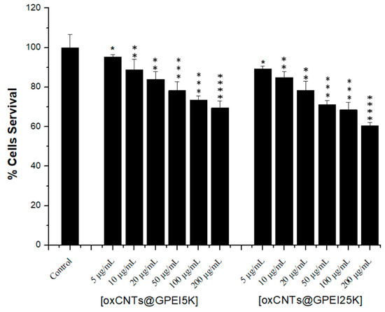 Comparative toxicities of oxCNTs@GPEIs on COS-7 cells after a 24-h incubation time at various concentrations as determined by MTT assays. Data are expressed as mean ± SD of six independent values obtained from at least three independent experiments. The statistical significance, obtained from Student’s paired two-tailed t-tests, follows the assignment: * p < 0.05, ** p < 0.01, *** p < 0.001, and **** p < 0.0001.