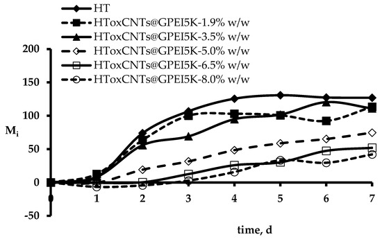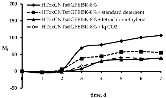 As mentioned, in order to assess the antibacterial properties of the as prepared HTs, a novel and easily applied method based on the quantifiable relationship of Chl α fluorescence (F0) and Cyanobacteria growth was used [65]. The method employs Synechococcus sp. PCC7942 to monitor the differences between bacterial growth on raw wool and on HT wool samples, by comparing the change in Chl α fluorescence every 24 h for seven days in an incubator under white fluorescent light (100 μE·m−2·s−1) at 31 °C. Figure 4 shows cyanobacterial Chl α fluorescence changes (Mi) on HToxCNTs@GPEI5K adapted cells.
