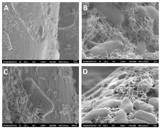 Figure 6A,B, shows SEM images of cyanobacteria grown on HToxCNTs@GPEI5K-8%wt. fibers. oxCNTs@GPEI5K are highly dispersed on the fibers’ surface, to such an extent that individual CNTs can be distinguished. In Figure 6C,D cyanobacteria can be seen on the surface of the fibers. Some have already been destroyed as their shape has charged and others are in contact with CNTs, which are attached to the outer surface of the cells or have penetrated their cell wall.
