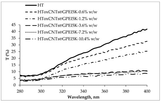 where Eλ represents the relative erythemal spectral effectiveness, Sλ the solar spectral irradiance (W·cm−2·nm−1), Tλ the average spectral transmittance of nine transmission measurements (measurements were taken at 0°, 45° and 90° for triplicates of each HT sample) and ∆λ the measured wavelength interval (nm).