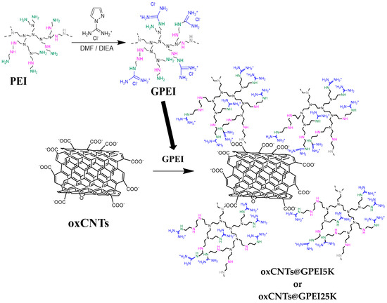 GPEIs functionalized oxCNTs were synthesized as described in our previous publications [50]. In brief, in the first step (Scheme 1), hyperbranched polyethyleneimines (PEI) having molecular weights of 5000 or 25,000 Da were functionalized at the primary amino groups with guanidinium groups following a known guanidylation reaction, affording two guanidinylated PEI derivatives, i.e., GPEI5K and GPEI25K [50,52]. Specifically, 0.01 mmol of PEI5K or PEI25K dissolved in DMF (10 mL), and then were added to a 10 mL DMF solution containing 0.4 mmol or 2 mmol 1H-Pyrazole-1-carboxamidine hydrochloride and 0.8 mmol or 4 mmol DIPEA, for the two molecular weights respectively. The reaction mixture was stirred at room temperature in inert atmosphere for 24 h. Then the crude products were obtained after precipitation in diethyl ether and subsequent vacuum drying. Finally, the guanidinylated products, GPEI5K and GPEI25K, were received after purification by dialysis against distilled water and lyophilization. The chemical structures of the polymers were established by 1H and 13C NMR spectroscopy, using a Bruker Avance DRX spectrometer operating at 500, and 125.1 MHz (Bruker Biospin, Rheinstetten, Germany), respectively, at 25 °C, and D2O as solvent. The successful introduction of guanidinium groups to PEI was confirmed by a new peak at 3.25 ppm, presented in the 1H NMR spectra of both PEI derivatives (Figure S1), assigned to the protons of α methene groups close to guanidinium groups as well as to the new peaks, observed in the 13C NMR spectra of both PEI derivatives (Figure S2), at: (i) 157.0 ppm, assigned to the guanidinium group carbon, and (ii) 39.4 and 40.5 ppm attributed to the α-CH2 groups close to the guanidinium groups, respectively. Comparing the integration of the peaks at: (i) 3.25 ppm and (ii) 2.70–2.50 ppm, attributed to the protons of methyl groups of PEI scaffold, the degree of functionalization of PEI5K and PEI25K was found to be 98% and 95% substitution degree of the primary amino groups, respectively.