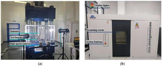 To analyze the dynamic mechanical properties, failure modes, and their relationships with internal structures under different loading rates, a uniaxial dynamic loading mechanical testing system and a coal-rock CT scanning and multi-field coupling system (Figure 1), both independently developed by the China Coal Research Institute, were utilized. The uniaxial dynamic loading system supports static loading tests, fatigue loading tests, and axial loading up to 2000 kN, with a maximum impact velocity of 25 mm/s and a minimum displacement loading rate of 0.01 mm/min. It features multiple waveform inputs, multi-data transmission channels, and static/dynamic dual-channel acquisition cards with a maximum sampling frequency of 10 kHz. The CT scanning and multi-field coupling system achieves a scanning resolution of 2 μm and provides a maximum axial pressure of 200 MPa, maximum confining pressure of 25 MPa, and displacement pressure of 35 MPa, enabling non-destructive detection of internal microstructures such as fractures and mineral distributions.