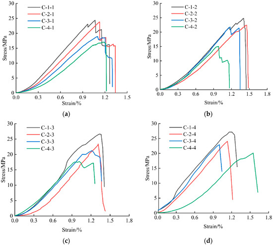 Stress–strain curves under different loading rates were plotted based on experimental data (Figure 3). For specimens in low fracture density groups (C-1 and C-2) tested at 0.001 s−1 or strain rates of 0.01–0.05 s−1, the elastic deformation stage prolonged with increasing fracture density. However, this trend became less pronounced for high fracture density groups (C-3 and C-4) under 0.01–0.05 s−1. The results suggest that while the elastic deformation stage generally extends with fracture density, strain rate introduces complexity through coupled interactions with fractures.