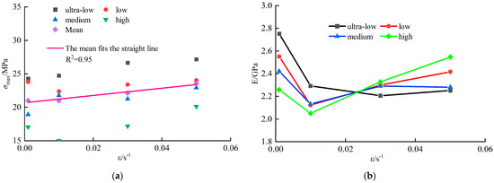 As shown in Figure 4a, the uniaxial compressive strength (σmax) of coal specimens ranged from 15–28 MPa, exhibiting an overall upward trend with increasing strain rate. A linear fit (R2 = 0.95) confirms a strong positive correlation between σmax and strain rate.