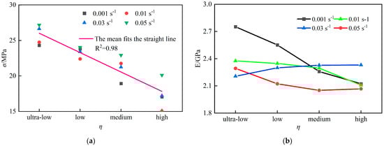 Figure 5b demonstrates the evolution of E with η. At 0.001 s−1, E decreased by 24.8% (from 2.75 GPa to 2.25 GPa) as η increased. In contrast, under 0.01–0.05 s−1, E declined only 6.6% (from 2.25 GPa to 2.10 GPa). This indicates that fracture density more critically impacts strength than stiffness, while strain rate amplifies the coupling effects between defects and mechanical responses.