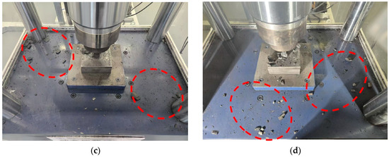 Under different strain rate conditions, the ejection distance of the coal fragments is mainly concentrated within the red-circled area of the blue operating platform, and the ejection distance generally increases with strain rate. As a manifestation of dynamic failure, the ejected coal fragments show slight variations in particle size under different strain rate conditions, as illustrated in the red circle in Figure 7. To more intuitively analyze and compare the degree of fragmentation of the coal samples under different loading rates, the fractal dimension D is calculated based on the relationship between fragment mass and equivalent side length. This quantifies the distribution characteristics of the fragments [25]. A higher fractal dimension indicates a larger number of fragments with smaller volumes, signifying a higher degree of fragmentation. The calculation formula is as follows.