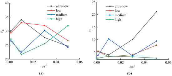 From the constitutive model calculation results in Table 3, it can be observed that the parameters F0 and m exhibit a certain correlation with the strain rate and fracture porosity. To illustrate this relationship more clearly, a line chart is plotted with the strain rate as the horizontal axis, as shown in Figure 8.