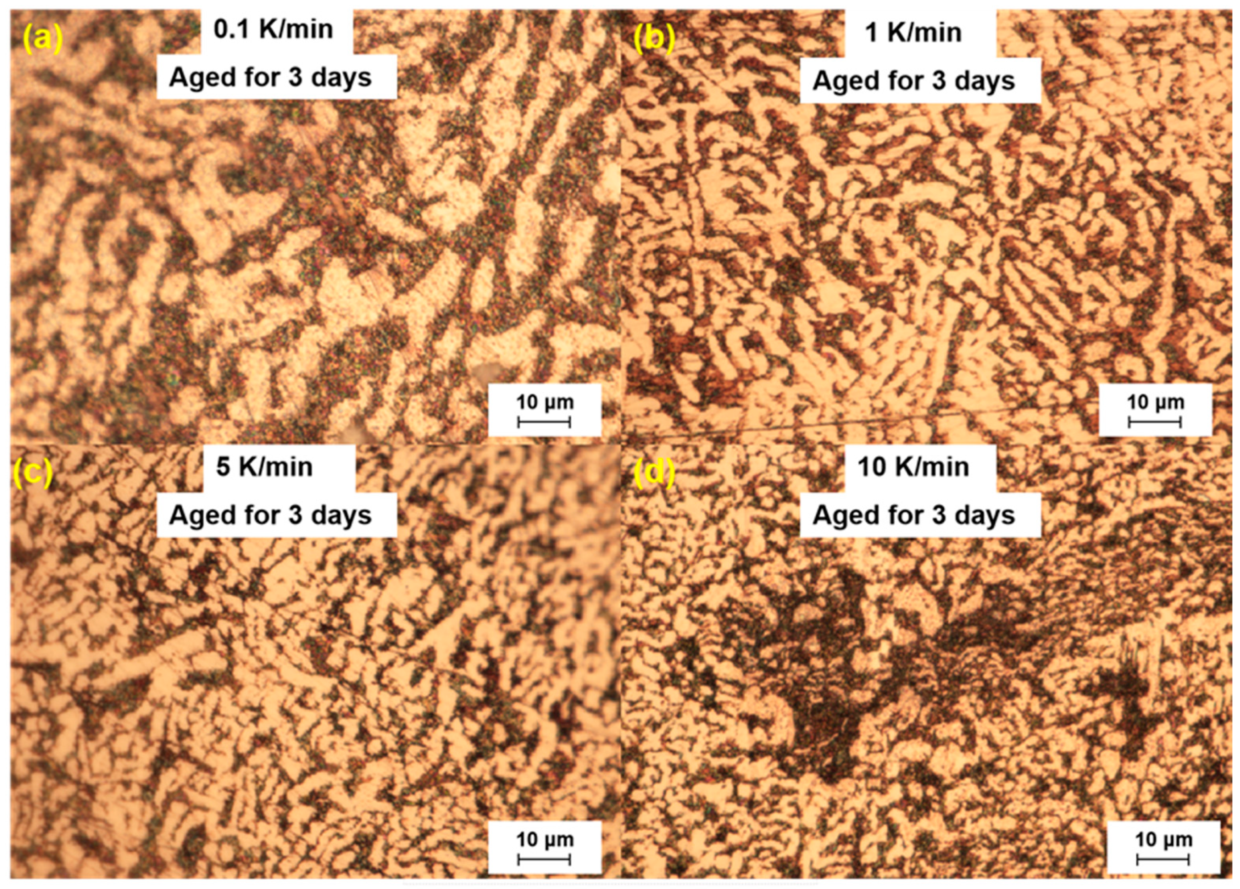 Figure 2. In the optical microscopy images, it was observed that the LBE samples obtained with different cooling rates all exhibited a microstructure with bright and dark areas. The bright areas mainly showed fishbone-like structures, considering that the γ-phase has better corrosion resistance than the β-phase. It can be confirmed that the bright phase was the γ-phase and the dark phase was the β-phase.