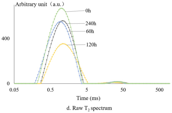 13]. The spin echo decay (SED) curve is transformed into the T2 spectrum via the Fourier transform. According to the calculation formula for RHI and the principles of NMR, the RHI value and the estimated spin-echo sequence amplitude at t = 0 of the normalized T2 spectrum from LF-NMR are consistent, meaning the cumulative amplitude is the sum of all T2 components, i.e., the normalized peak total area [