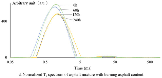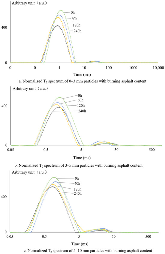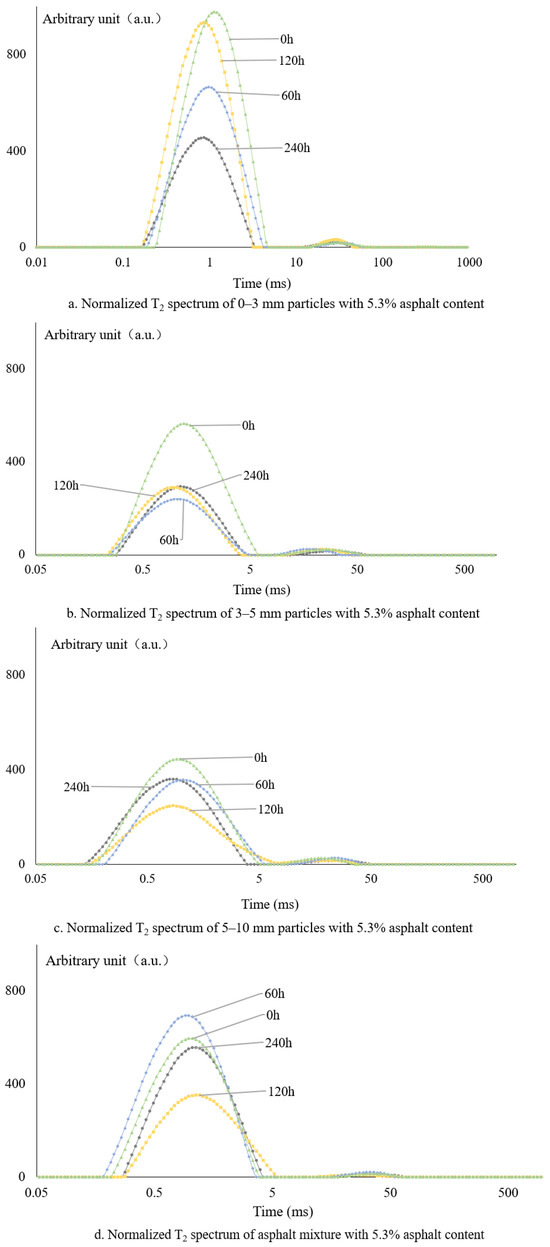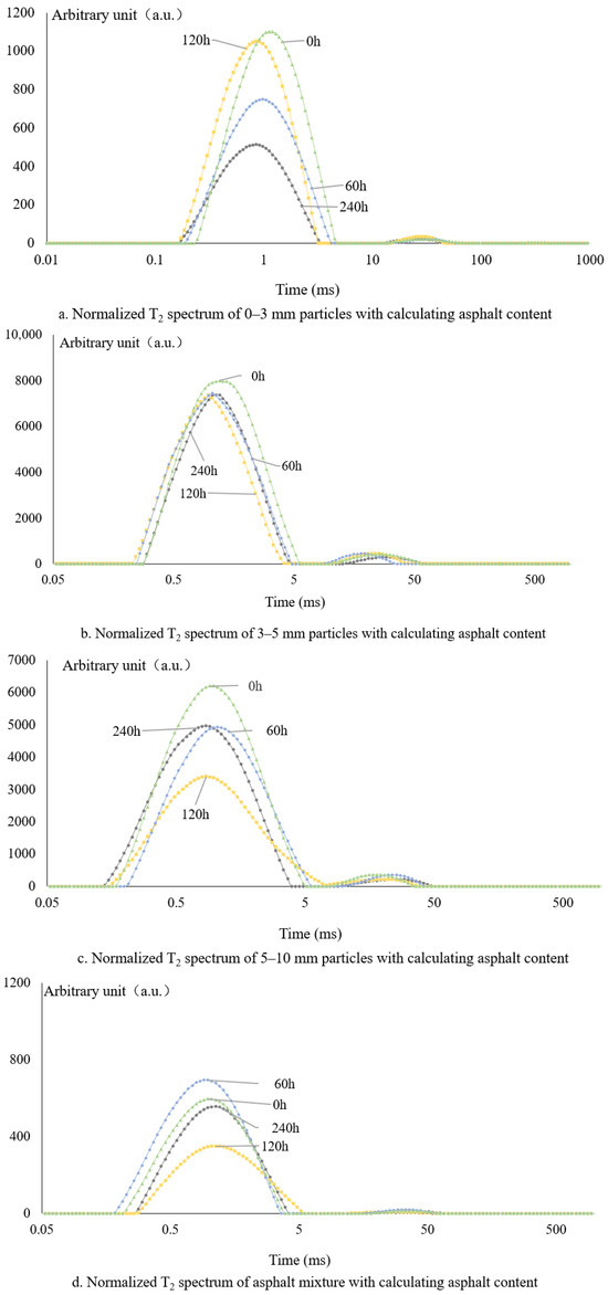 As the aging time increases from 0 h to 60 h, 120 h and 240 h, the three-graded particles of asphalt mixture (0–3 mm, 3–5 mm, 5–10 mm) and the NMR spectrum approach the total area of the normalized peak, which are clearly related to the asphalt content.
