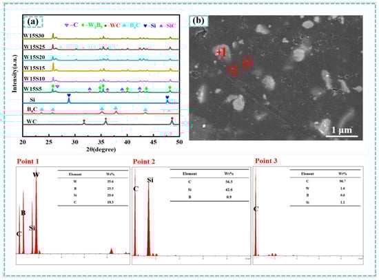 Figure 1b presents the EDS analysis W15S15 composite. By integrating the XRD and EDS composition results, it was evident that the white particles corresponded to the W2B5 phase, the dark gray particles represented SiC, and the black regions indicated the C phase. The morphology of the W15S15 composite revealed that the C phase served as the matrix phase. Following the sintering process, a matrix skeleton was established. The W2B5 and SiC particles, which were generated during the reactive sintering process, functioned as reinforcing phases and were uniformly distributed within the matrix, effectively filling the voids between the C particles. Consequently, the W2B5 and SiC phases occupied the pores within the matrix, significantly decreasing the porosity of composites and facilitating its densification.
