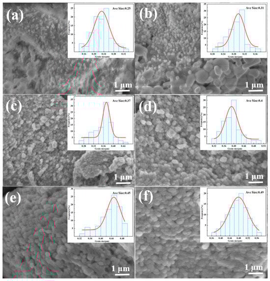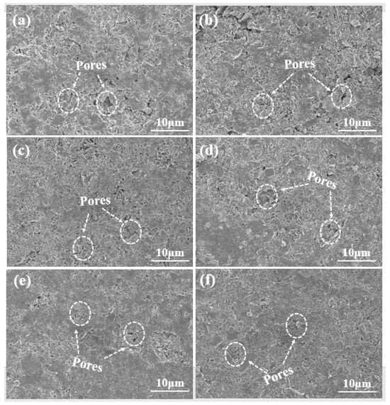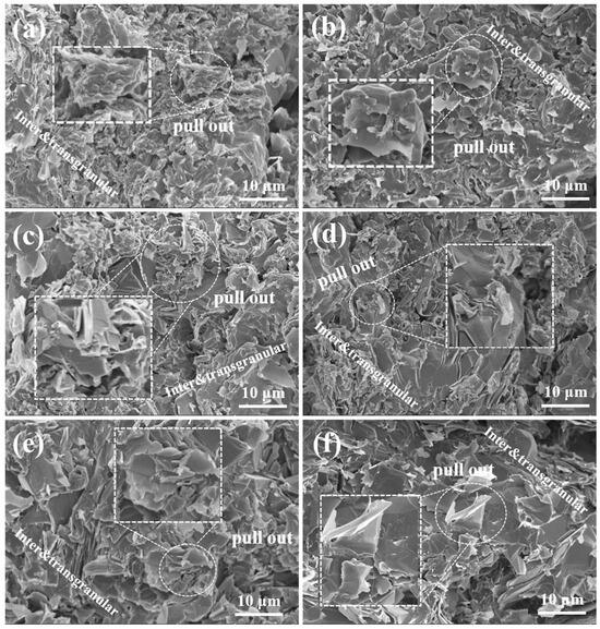 As the Si content increased, there was a gradual formation of SiC particles through a reaction, resulting in a decrease in material porosity. The composites in Figure 5b appeared denser, with sintered sample particles being thin, uniform, and showing low porosity and minimal defects. The cross-section looked relatively smooth, suggesting enhanced interface bonding strength between particles due to the presence of SiC. Various fracture modes existed in composites due to the interaction between the matrix and toughening phase [49]. The energy consumed during crack propagation by crack deflection caused through ceramic-phase particles, such as SiC and W2B5, led to strength enhancement. The combination of transgranular and intergranular fractures characterized the fracture mode of composites. Under external force, sliding friction at interfaces was higher than at weak grain boundaries. In the case of the W15S10 composite fracture, the pull-out of a peel-like dissociation surface indicated improved fracture toughness, attributed to intragranular fracture consuming more surface area than intergranular fracture. Transgranular fractures, mainly in large grains, were visible in Figure 5e,f, with pores in large grains leading to a higher proportion of transgranular fractures. Notable pores in the cross-section highlight the significant toughening effect of SiC-W2B5/C composites.