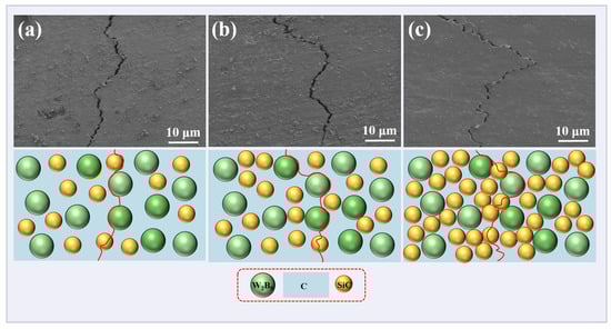The crack propagation paths of SiC-W2B5/C composites are depicted in Figure 6. The presence of plate-like W2B5 particles and SiC influenced fracture toughness, with higher SiC content resulting in increased crack deflection and a toughening effect from the drawing and bridging of plate-like grains. This led to a change in the crack propagation path, with increased energy consumption reducing crack propagation along crystals. As in Figure 6b, the shift toward the interface of the second-phase particles altered the fracture process to a combination of intergranular and transgranular processes, enhancing the toughness of composites. Higher SiC content increased the probability of contact with reinforced particles during crack propagation, leading to increased deflection and improved fracture toughness [50]. Furthermore, in Figure 6c, higher SiC content promoted a more evident grain growth trend, where plate-shaped grains pinned grain boundaries, allowing for even grain growth with fewer defects, directly impacting crack occurrence, strength, and toughness.