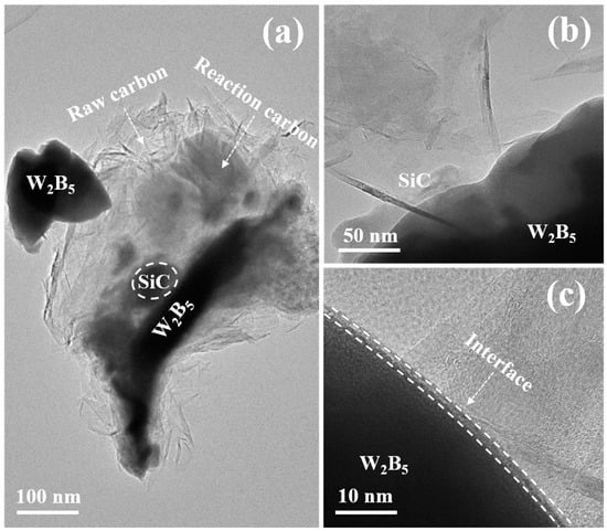 The surface of the carbon material was inherently inert, making it challenging to sinter. However, the Si powder in the raw material created a liquid phase at elevated temperatures, facilitating rearrangement and filling the gaps between carbon material layers. Through prolonged exposure to high temperatures and pressures, Si and C undergo an in situ reaction to produce SiC, thereby decreasing the pores within the matrix and promoting densification. The TEM morphology of the composite with 15 vol% Si powder content is illustrated in Figure 7. It depicts the distribution of phases in the samples of SiC (light-colored area), W2B5 (dark-colored area), and C (gray-white area). SiC particles were uniformly dispersed in the graphite phase. Upon melting, the Si powder diffused between the graphite sheets, reacting in situ to form SiC. The majority of the SiC maintained a quasi-flake structure, dispersed in the carbon phase matrix, filling the matrix’s voids and densifying the microstructure during hot-pressing.