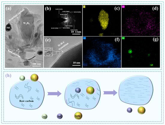 TEM images and graphitization mechanism schematic of the W15S15 composite. (a) TEM of W15S15, (b) SAED images of SiBC, (c,d,f,g) elemental maps of W, B, C and Si. (e) HRTEM images of W15S15, (h) graphitization mechanism schematic of SiC-W2B5/C composites.
