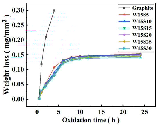Figure 9 illustrates the relationship curve between weight loss per unit area and oxidation time of SiC-W2B5/C composites after exposure to air at 600 °C for 24 h. The oxidation weight loss in the initial 6 h showed a nearly linear correlation with oxidation time, suggesting a gradual stabilization as oxidation progressed. This behavior was attributed to the preferential oxidation of carbon on the composite material’s surface during the early stages, due to its higher content compared to the ceramic phase. Consequently, W2B5 and SiC initially exhibited low oxidation levels, which hindered the formation of a protective oxide layer. As oxidation advanced, the oxidation degree of W2B5 and SiC increased, resulting in a consistent weight loss pattern. After 6 h, weight loss stabilized due to the formation of a protective film of B2O3 and SiO2 on the surface, which prevented further oxidation. The Si-B-O oxide layer, formed by the interaction of B2O3 and SiO2, effectively sealed the material’s surface, reducing pore formation and halting additional oxidation.