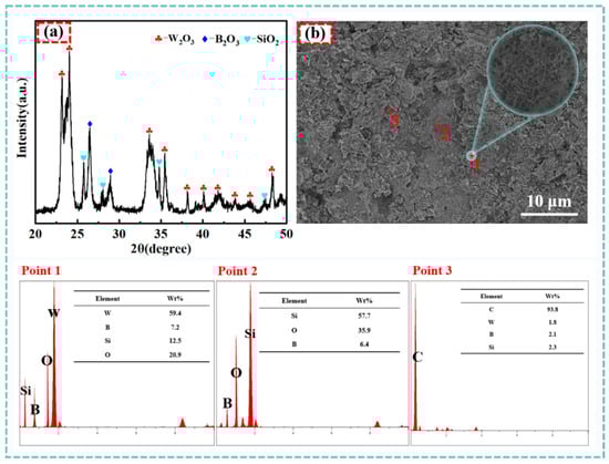 Figure 10 depicts the XRD pattern of the W15S15 composite material surface after 6 h of oxidation. Figure 10a presents an XRD analysis of W15S15 at 800 °C. The oxidation surface revealed that the composite oxidized to form WO3, B2O3, and SiO2. As illustrated in Figure 10b, the oxidation surface appeared loose and porous, with the oxide layer composed of small, quasi-ball-shaped particles. EDS analysis indicated that these particles consist of the elements W, O, Si, and B. Combined with the XRD results, this supports the identification of the materials as WO3, SiO2, B2O3, and B2O3 in a liquid form, exhibiting local bonding that encapsulated WO3 and SiO2 particles. The white spherical particles corresponded to WO3, while the granular-like agglomerates represented SiO2. The lamellar material signified C, and the morphology of B2O3 was less distinct due to its liquid state, which bound to and encased the SiO2 and W2O3 particles. The continuous and dense oxidation layer effectively prevented O2 from penetrating the interior, thereby reducing the oxidation of each phase within the substrate and enhancing the composites’ antioxidant properties.