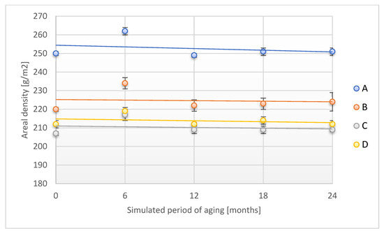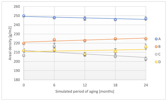 Change in areal density of the tested adhesion tapes during the accelerated aging using UV. A—POLI TACK 850; B—POLI TACK 854; C—ORAGUARD 210; D—ORAGUARD 215.