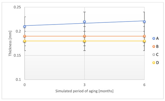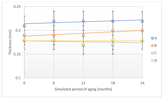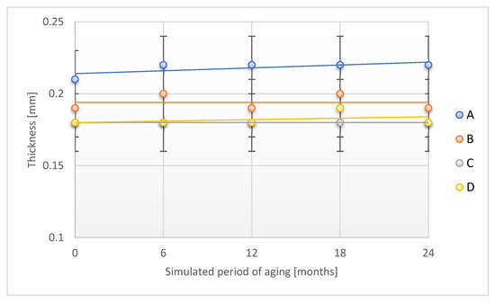 Studies have found no effect of the aging process with the use of temperature and humidity on B, C, and D sample thicknesses after a period of simulated 24 months of storage under real conditions. Compared to the original value, a slight increase in the thickness value for the A sample was found after the discussed aging period (an increase of 4.8%), which was consistent with the observations made for aging studies using only temperature as an aging factor.