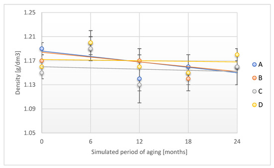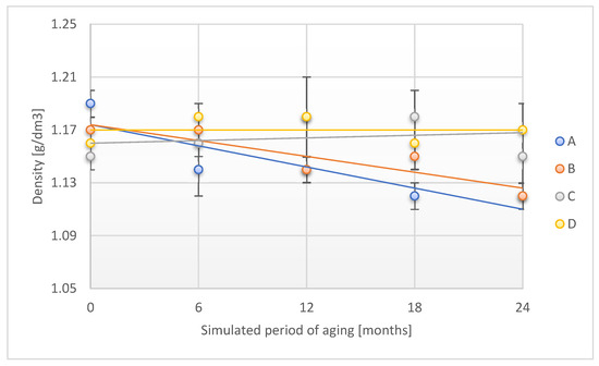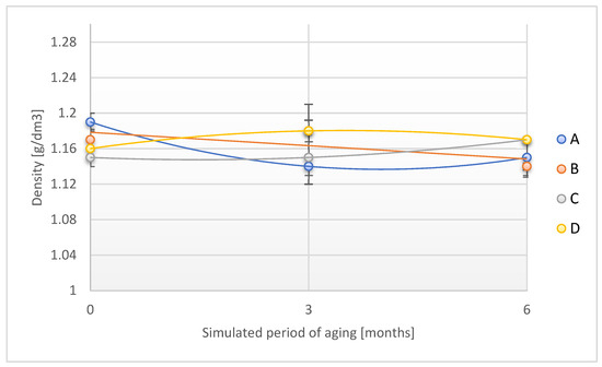 Change in density of the tested adhesion tapes during the accelerated aging using temperature and humidity: A—POLI TACK 850; B—POLI TACK 854; C—ORAGUARD 210; D—ORAGUARD 215.