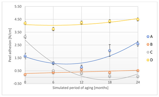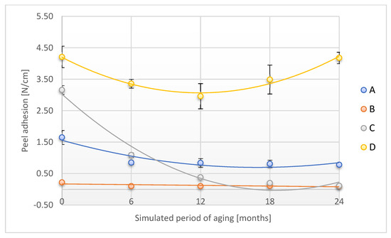 Change in peel adhesion of the tested adhesion tapes during the accelerated aging using temperature and humidity: A—POLI TACK 850; B—POLI TACK 854; C—ORAGUARD 210; D—ORAGUARD 215.