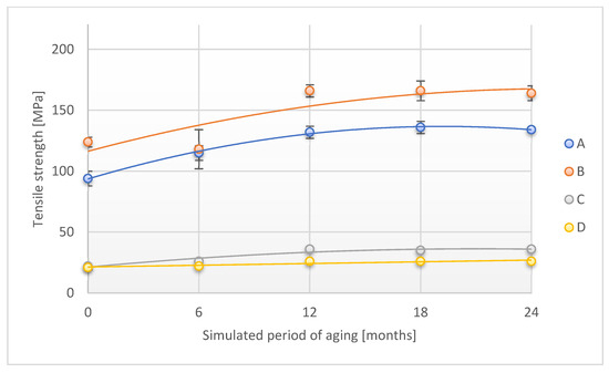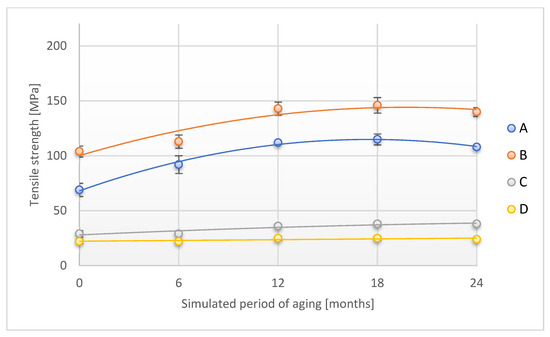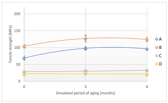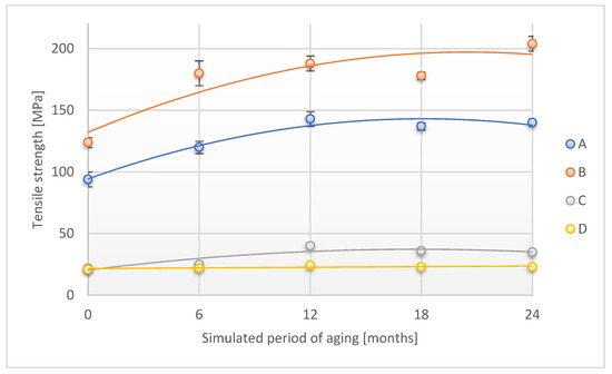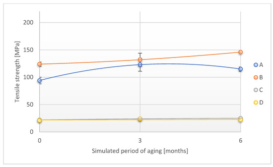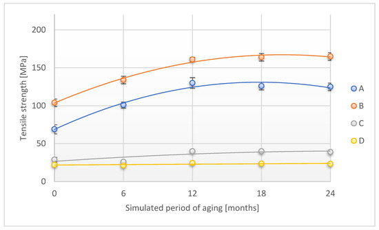 Change in tensile strength (direction 1) of the tested adhesion tapes during the accelerated aging using temperature and humidity: A—POLI TACK 850; B—POLI TACK 854; C—ORAGUARD 210; D—ORAGUARD 215.