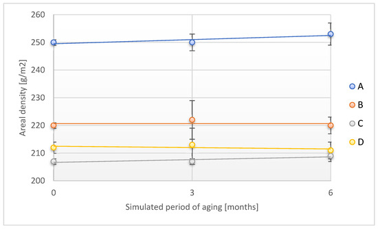 The areal density of the tested tapes before and after the accelerated aging process was determined according to the PN-ISO 4592:1998 standard [30].