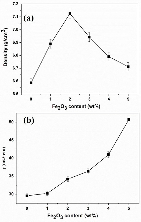(a) Density and (b) electrical resistivity of FeSi-Fe2O3 SMC samples, respectively.