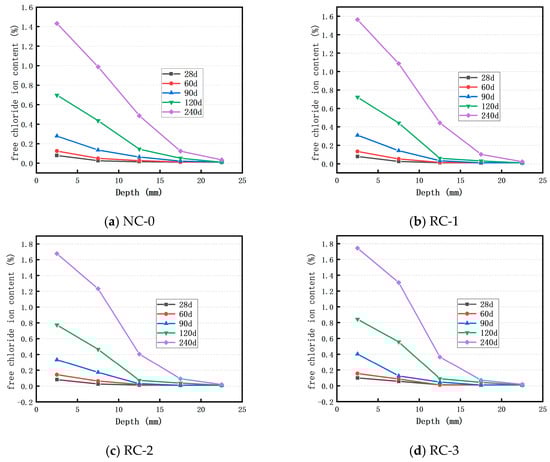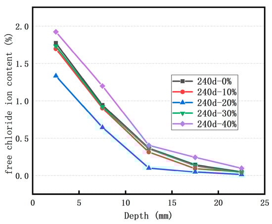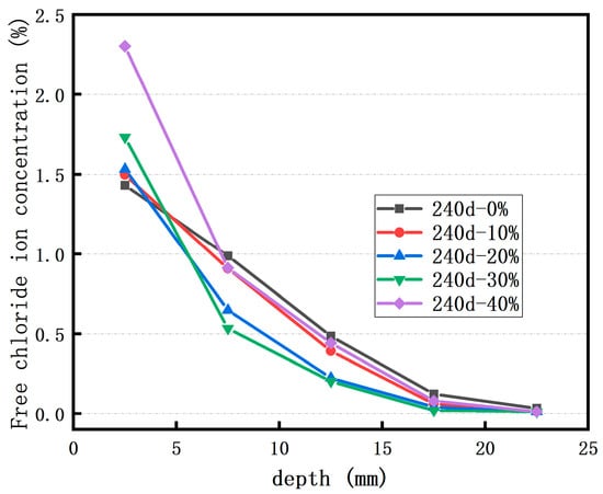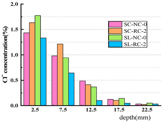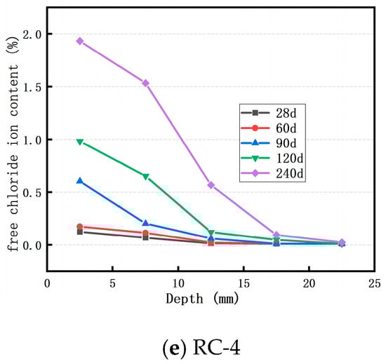 - The Cl− ion concentration in concrete at the same depth increases as the soaking time lengthens. Incorporating an appropriate amount of RFP into concrete can enhance the concrete’s resistance to Cl− ion penetration. When the RFP replacement rate is 20%, the concrete demonstrates good resistance to Cl− ion erosion in both the sodium chloride solution and the Salt Lake brine solution.