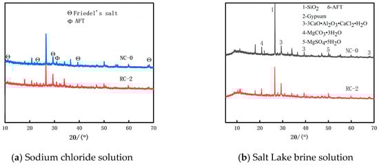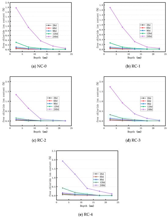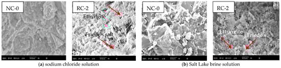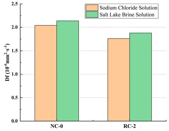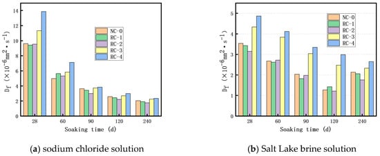 - Compared with erosion in the sodium chloride solution, after soaking in Salt Lake brine for 240 days, the Cl− ion diffusion coefficients Df of NC-0 and RC-2 are 2.14 × 10−6 mm2·s−1 and 1.88 × 10−6 mm2·s−1, respectively, increasing by 0.1 × 10−6 mm2·s−1 and 0.12 × 10−6 mm2·s−1 compared with the erosion in the sodium chloride solution. The results show that the damage degree in the Salt Lake solution is stronger than in the sodium chloride solution at the latter age. This indicates that as the soaking time increases, the inhibitory effect of sulfate ions in the Salt Lake brine on the penetration of chloride ions gradually disappears. Sulfate erosion leads to the generation of a large amount of volume-expanding substances, increasing the number of pores in the concrete, which makes the penetration of chloride ions easier.
