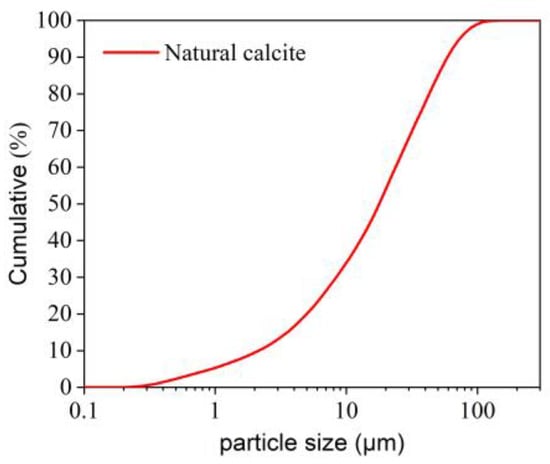 In this research, two calcites from natural and synthetic sources were used for experiments. The synthetic calcite was an analytical reagent of calcium carbonate (AR CaCO3), and the natural calcite was a commercial product from Yangzhou, China, with an average particle size of 5.7 μm; the particle size distribution of natural calcite is shown in Figure 1. The chemical compositions of the two calcites are listed in Table 1. The composition of the synthetic calcite is provided by the manufacturer (Tianjin Fuchen Chemical Reagent Factory, Tianjin, China), whereas the composition of natural calcite was determined by X-ray Fluorescence Spectrometer.