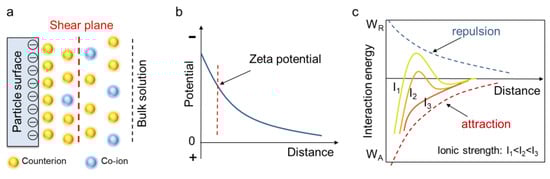 Zeta potential and DLVO theory. (a) Formation of electric double layer due to ionic adsorption. (b) Schematic illustration of zeta potential. (c) DLVO theory and the effect of ionic strength.