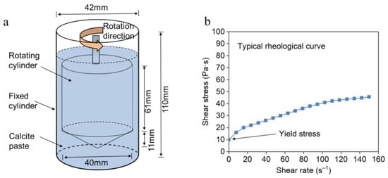 The rheology test was conducted using a Brookfield R/S Plus Rheometer (Brookfield, Middleboro, MA, USA) with a coaxial cylinder of type CC40 at room temperature. The size of the coaxial cylinder is shown in Figure 3a. The calcite paste was prepared by mixing 200 g of natural calcite with 90 g model solution in a Hobart mixer, thus obtaining a dense calcite paste with a solid–liquid ratio of 0.45 by weight. Then, 68.5 mL of fresh mixed calcite paste was transferred into the cylinder and the rheological test was conducted immediately. The concentrations of model solutions for rheological experiments were in the gradient of 1 mM, 10 mM, 20 mM, 40 mM and 80 mM, with 10 mM background electrolyte NaNO3 included. Compared with the concentration of model solutions, the ionic increase induced by calcite dissolution is much smaller (0.15 mM), which has negligible effects on the rheological behavior of calcite paste. The rheological curves were obtained by increasing the shear rate from 0 to 150 s−1 in 90 s, and shear stress and viscosity were automatically recorded by the equipment.