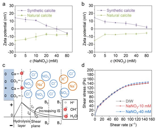 Zeta potential and rheological behavior of calcite paste with indifferent ions. The effect of (a) Na+ and (b) K+ on zeta potential of natural and synthetic calcite. (c) EDL structure of synthetic calcite in a solution of indifferent ions and the effect of ionic strength on zeta potential evolution. (d) The effect of NaNO3 concentration on rheological behavior of natural calcite paste.