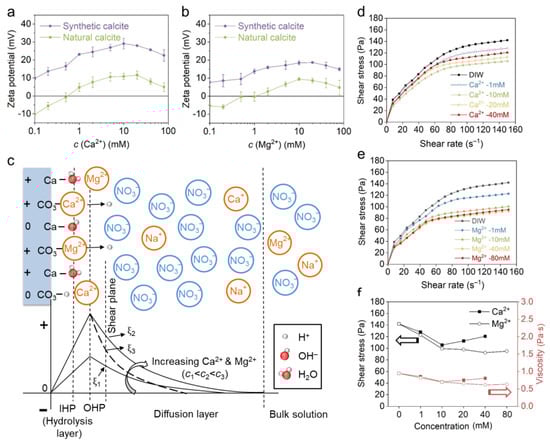 The effect of (a) Ca2+ and (b) Mg2+ on zeta potential of natural and synthetic calcite. (c) The EDL structure of synthetic calcite and zeta potential evolution in increasing PDI concentration. The effect of (d) Ca2+ and (e) Mg2+ on natural calcite paste rheology. (f) Comparison between the effect of Ca2+ and Mg2+ on the shear stress and viscosity at a shear rate of 150 s−1 (the black and red lines indicate the shear stress and viscosity, respectively).
