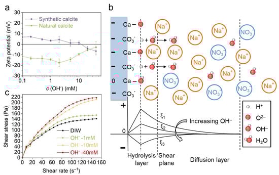 (a) The effect of OH− on the zeta potential of natural and synthetic calcite. (b) The EDL structure of synthetic calcite and the zeta potential evolution in OH−. (c) The effect of OH− on the rheological behavior of natural calcite paste.