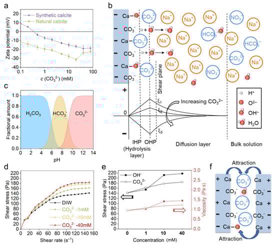 (a) The effect of Na2CO3 on the zeta potential of natural and synthetic calcite. (b) The EDL structure of synthetic calcite in Na2CO3 solution and the evolution of zeta potential. (c) The fractional amount of carbonate species as a function of pH, adapted from Mahrouqi et al. [29,42]. (d) The rheological behavior of natural calcite paste with Na2CO3 solutions. (e) Comparison between the effect of NaOH and Na2CO3 on the shear stress and viscosity at a shear rate of 150 s−1 (the black and red lines indicate the shear stress and viscosity, respectively). (f) The specific attraction between calcite particles induced by the negative intermediate Helmholtz layer.