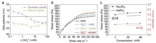 (a) The effect of SO42− on the zeta potential of natural and synthetic calcite. (b) The effect of SO42− on the rheological behavior of natural calcite paste. (c) Comparison between the effect of Na2SO4 and NaNO3 on calcite paste rheology at 150 s−1 (the black and red lines indicate the shear stress and viscosity, respectively).