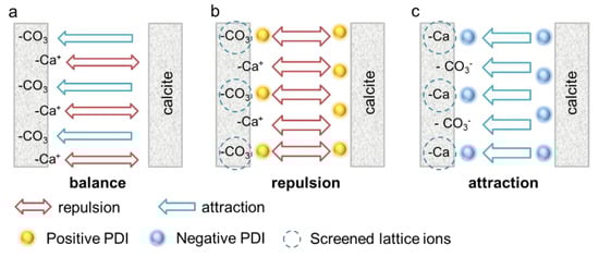 Specific interaction between calcite surfaces with the addition of different PDIs. (a) Calcite without PDI addition. (b) Positive PDIs screened the negative >CO32− sites, thus enhanced EDL repulsion. (c) Negative PDIs screened the positive >Ca2+ sites and induced a specific attraction.