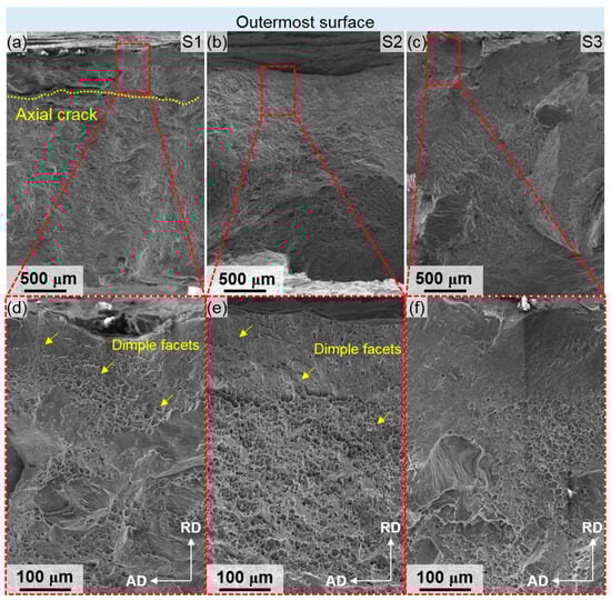 - The tube, operating at a rotational speed of 1120 r/min under water-cooling conditions, demonstrates a high hardening rate during the initial deformation stage. Although this hardening rate decreases rapidly in subsequent stages, the tube retains a sustained strain hardening capability throughout the entire process. Fracture morphology analysis reveals that the gradient layer plays a critical role in enhancing the tube’s resistance to fracture across its entirety. In contrast, when the rotational speed is reduced to 710 r/min or air cooling is used instead of water cooling, both the sustained strain hardening capacity and ductility of the tubes decline significantly;
