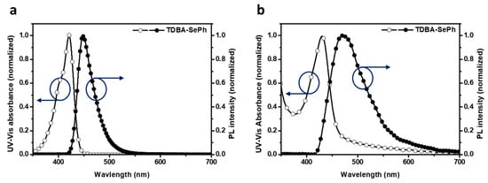 | TDBA-SePh | 420 | 447 | 35 | 14.0 | 430 | 468 | 78 | 8.6 | 2.90/2.66/0.24 | 1.42 | −5.38 | −2.64 | 2.74 |
