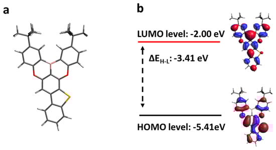 - Tanaka, H.; Oda, S.; Ricci, G.; Gotoh, H.; Tabata, K.; Kawasumi, R.; Beljonne, D.; Olivier, Y.; Hatakeyama, T. Hypsochromic shift of multiple-resonance-induced thermally activated delayed fluorescence by oxygen atom incorporation. Angew. Chem. Int. Ed. 2021, 60, 17910–17914. [Google Scholar] [CrossRef]