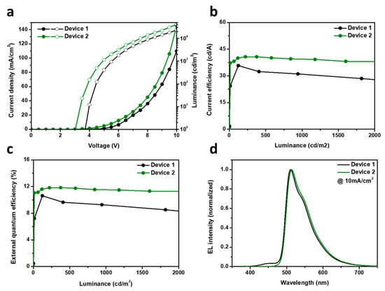 - Murawski, C.; Leo, K.; Gather, M.C. Efficiency roll-off in organic light-emitting diodes. Adv. Mater. 2013, 25, 6801–6827. [Google Scholar] [CrossRef]