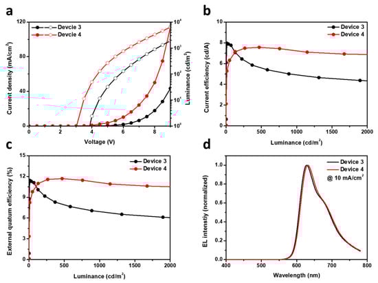 | Devices | Von a (V) | LE (cd/A) | Luminance (cd/m2) | EQE (%) | CIE (x, y) | ELmax (nm) | FWHM (nm) |